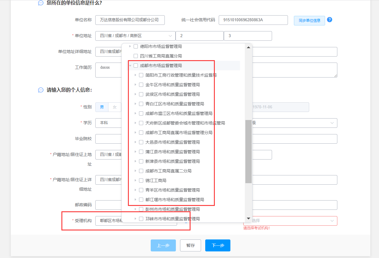 4) 选择受理机构和考试机构;根据需要选择受理机关和参加考试的机构。