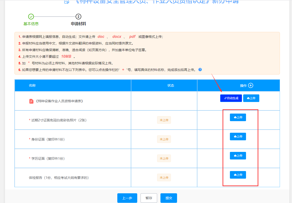 6) 上传申请材料;特种设备作业人员的申请表需要点击自动生成,可根据填写的信息自动生成,然后点击签名;其他需要上传的材料,点击上传按钮进行上传。